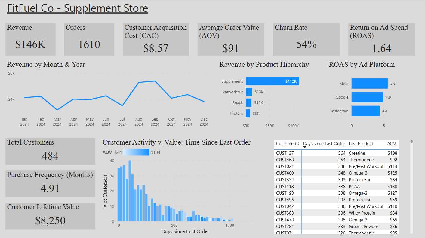 This supplement company had growing sales but lacked clarity on what was really driving performance. Customer behavior was hard to interpret, ad ROI wasn’t tracked consistently, and they had no way of identifying churn risk. Most decisions were reactive, based on siloed spreadsheets or gut instinct — not data. As the business scaled, the lack of centralized, actionable insights made it difficult to optimize marketing, retain customers, or measure true profitability.