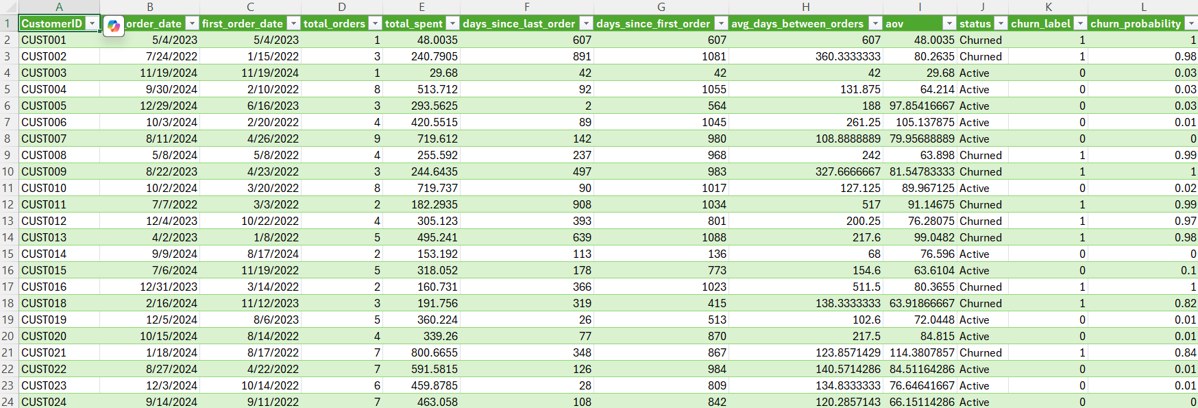 Churn probability scores generated by the model — each row represents a customer, with the final column showing their predicted likelihood to churn.